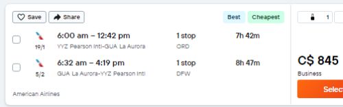 American Airlines has dropped the price of their Business Class flights from Toronto to Guatemala down to $845 CAD roundtrip including taxes.