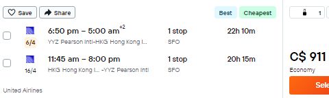 Toronto to Hong Kong - $910 CAD roundtrip including taxes