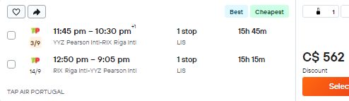 Google Flights: Toronto to Riga, Latvia