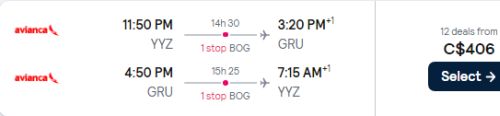 Avianca has dropped the price of a few flights from Toronto to Sao Paulo , Brazil down to $406 CAD roundtrip including taxes.